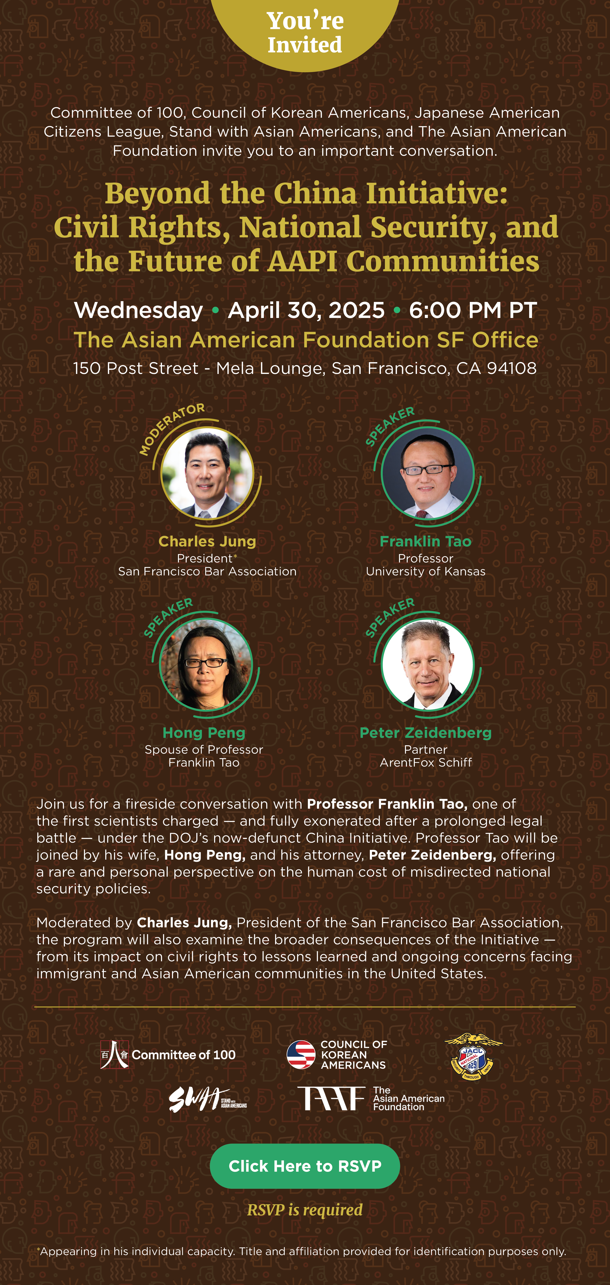 |  | | Beyond the China Initiative: Civil Rights, National Security, and the Future of AAPI Communities presented by JACL, CKA, TAAF, and Committee of 100 |