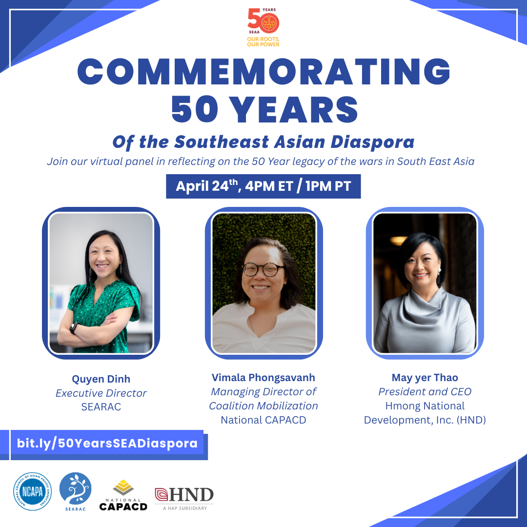 |  | NCAPA is excited to announce that on April 24th, 4PM ET / 1 PM PT, we will be convening our different Southeast Asian coalition members to host a panel commemorating the 50th Anniversary of the Wars in Southeast Asia. Participating will be SEARAC, National CAPACD, and Hmong National Development (HND) who will share about our advocacy work and reflect on what successes and what challenges we’re still facing after 50 years Register here: bit.ly/50YearsSEADiaspora Please join us for a virtual panel featuring: -
