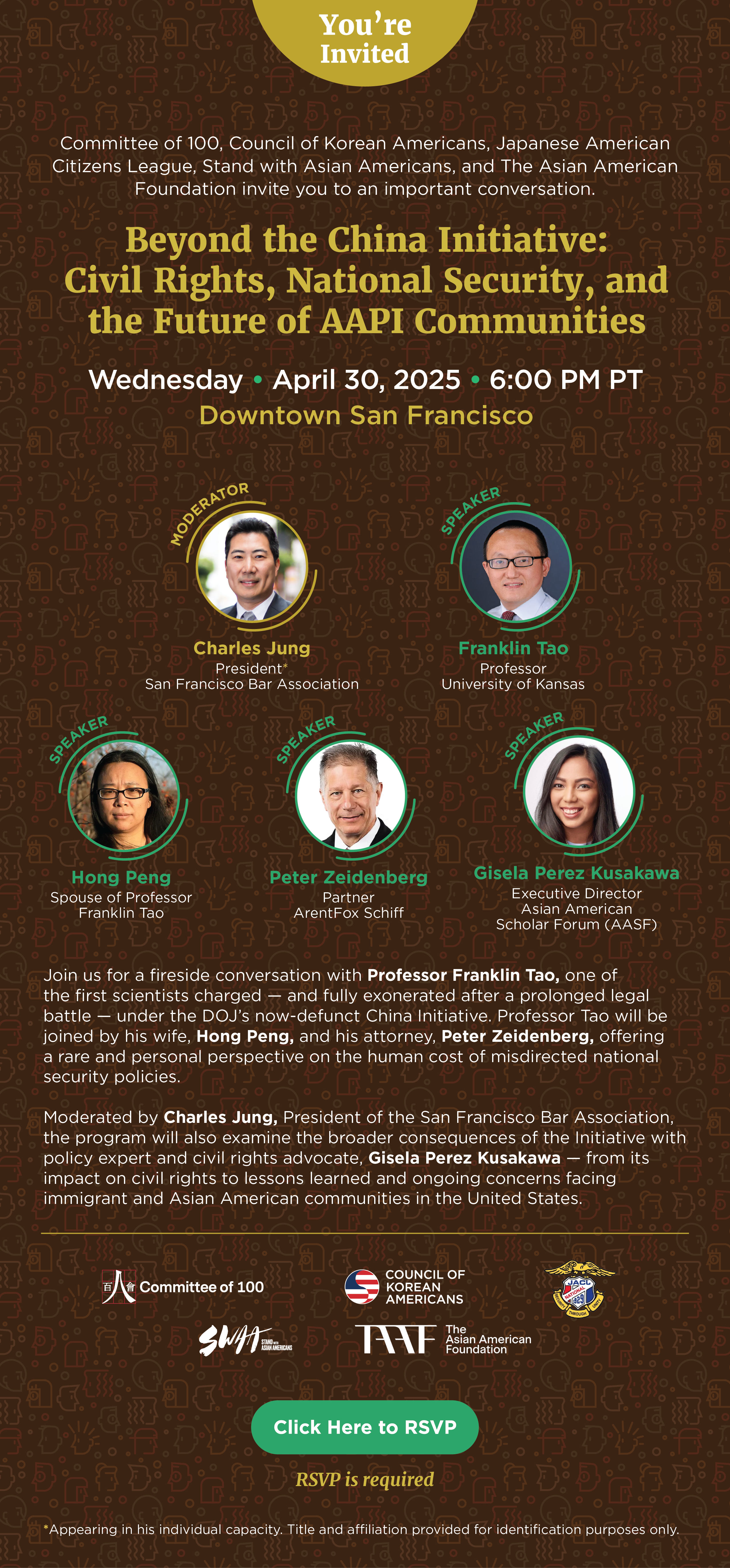 |  | | Beyond the China Initiative: Civil Rights, National Security, and the Future of AAPI Communities presented by JACL, CKA, TAAF, and Committee of 100 |