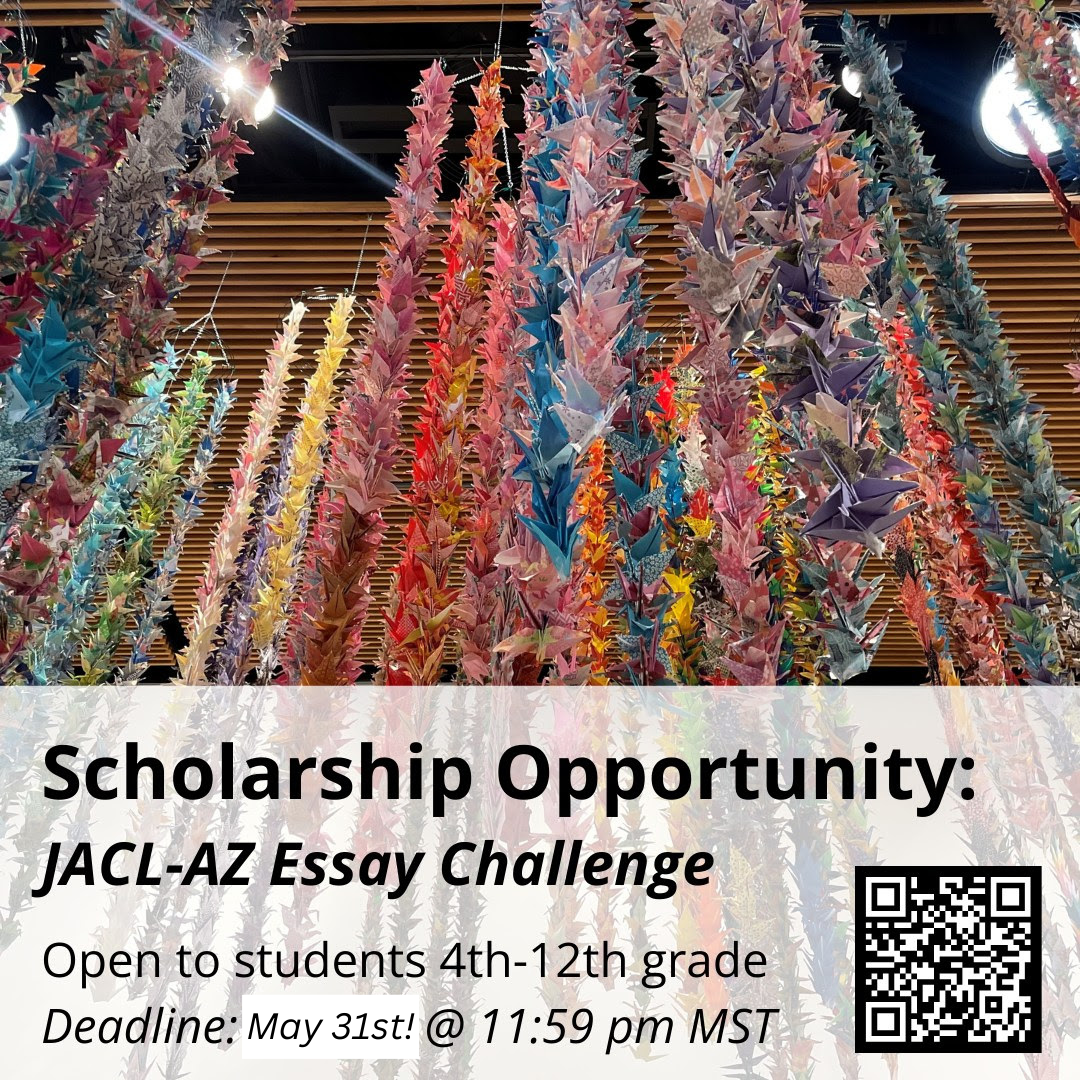 |  | The Chandler Museum has partnered with Japanese American Citizens League - Arizona Chapter (JACL-AZ) to invite students to participate in the 2025 Essay Challenge! This contest encourages young writers to explore the history of Japanese American incarceration during World War II and the importance of protecting civil liberties for all. Eligibility: Open to students residing in Arizona who meet ONE of the following criteria: Are a member (or have relatives who are a member) of JACL-AZ Chapter, Arizona Buddhist Temple, or Phoenix Life Church. Have visited the 2025 Chandler Museum Exhibit, Gaman: Enduring Japanese American Internment at Gila River. Essay Topics: Students should submit a well-organized, thought-provoking essay addressing: The history and reasons behind Japanese American incarceration during WWII. The lessons this history teaches us about justice and equality today. Ways to prevent future injustices through laws, education, and civic engagement. The significance of this history for all Americans, regardless of background. Submission Guidelines: Grades 4-8: 500-800 words Grades 9-12: 1,000-1,500 words Typed, double-spaced, 12 pt. Times New Roman font Must include a bibliography Deadline: All entries must be submitted by May 31, 2025, at 11:59 PM. Details and Submission Link: http://bit.ly/JACLAZ_Essay_Challenge_2025 Or scan the QR code |