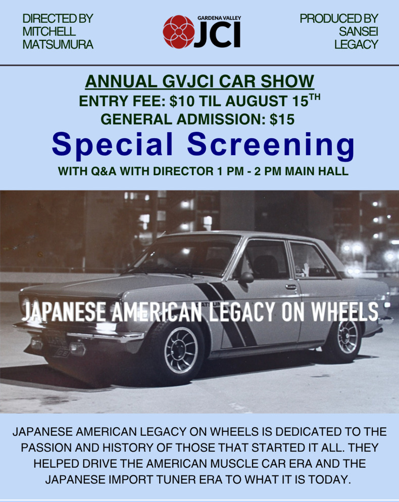 |  | “Japanese American Legacy on Wheels” Produced by Sansei Legacy, Directed by Mitchell Matsumura ANNUAL GVJCI CAR SHOW Saturday, August 16, 2025 ENTRY FEE: $10 TILL AUGUST 15TH, GENERAL ADMISSION: $15 Special screening with Q&A with Director 1pm-2pm Main Hall Continuous viewing 10am-3pm Nisei Veterans Memorial Hall (no sound) Gardena Valley Japanese Cultural Institute (GVJCI) 1964 W. 162nd Street Gardena, CA 90247 |