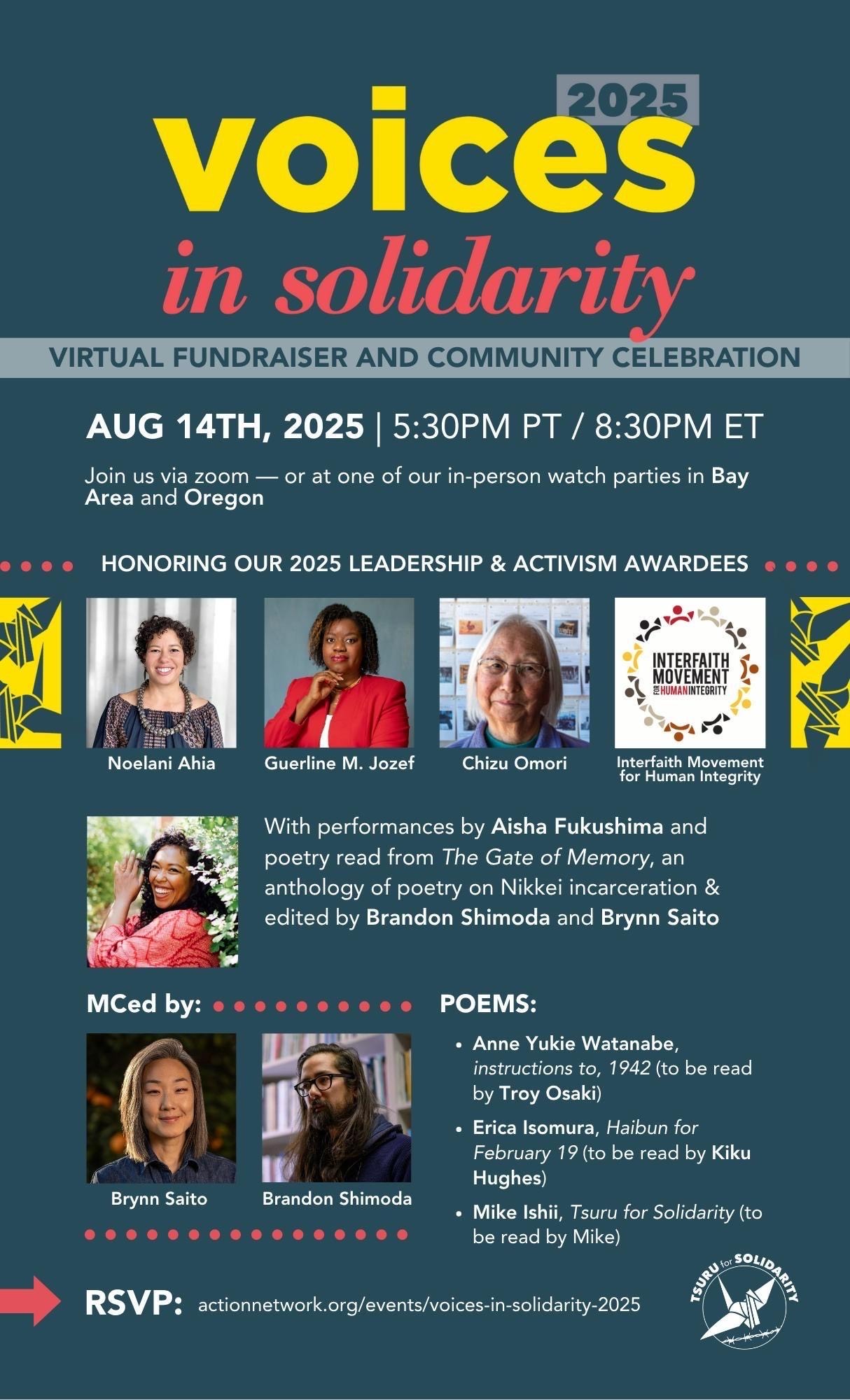 |  | Tsuru for Solidarity (TFS) is thrilled to announce its upcoming Virtual Fundraiser and Community Celebration and the locations of in-person Watch Parties. TFS is also excited to introduce the MCs for this year’s program! Please join us in welcoming Brynn Saito and Brandon Shimoda, two incredible poets and friends of Tsuru who bring deep heartfelt commitment to our shared work for justice. The Gate of Memory, edited by Saito and Shimoda, is a groundbreaking poetry anthology by descendants of WWII-incarcerated individuals, exploring intergenerational trauma and the enduring impact of mass incarceration in the U.S. and Canada. A selection of the poems will be read by descendants as the hosts highlight the resistance and liberation work of TFS campaigns and national partners. TFS will also honor this year’s recipients of the Tsuru Leadership and Activism Award! In addition, an empowering Nikkei singer/activist will be announced soon! Stay tuned for more details—we can’t wait to be in community with you. |