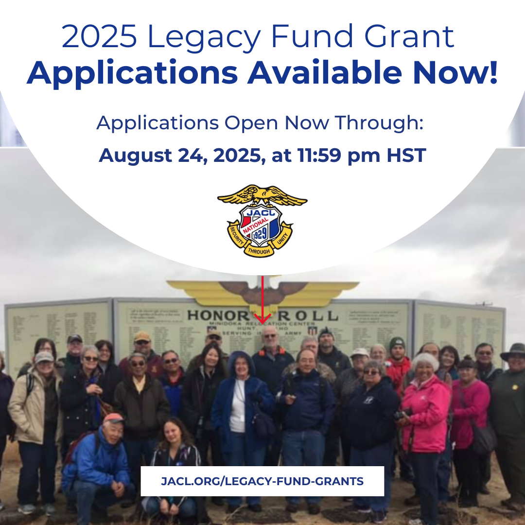 | 2025 Legacy Fund Grants Available Now Are you a chapter in good standing and thinking about furthering the mission and fulfilling the vision of the JACL? If so, apply for a 2025 Legacy Fund Grant today and use it as seed money to execute a multi-generational project or activity where your chapter (or district) can take a leadership role in local programming. To learn more, please visit the JACL National Legacy Fund Grant page here or click below. Applications are due by Sunday, August 24, 2025, at 11:59 pm Hawaiian Standard Time. |