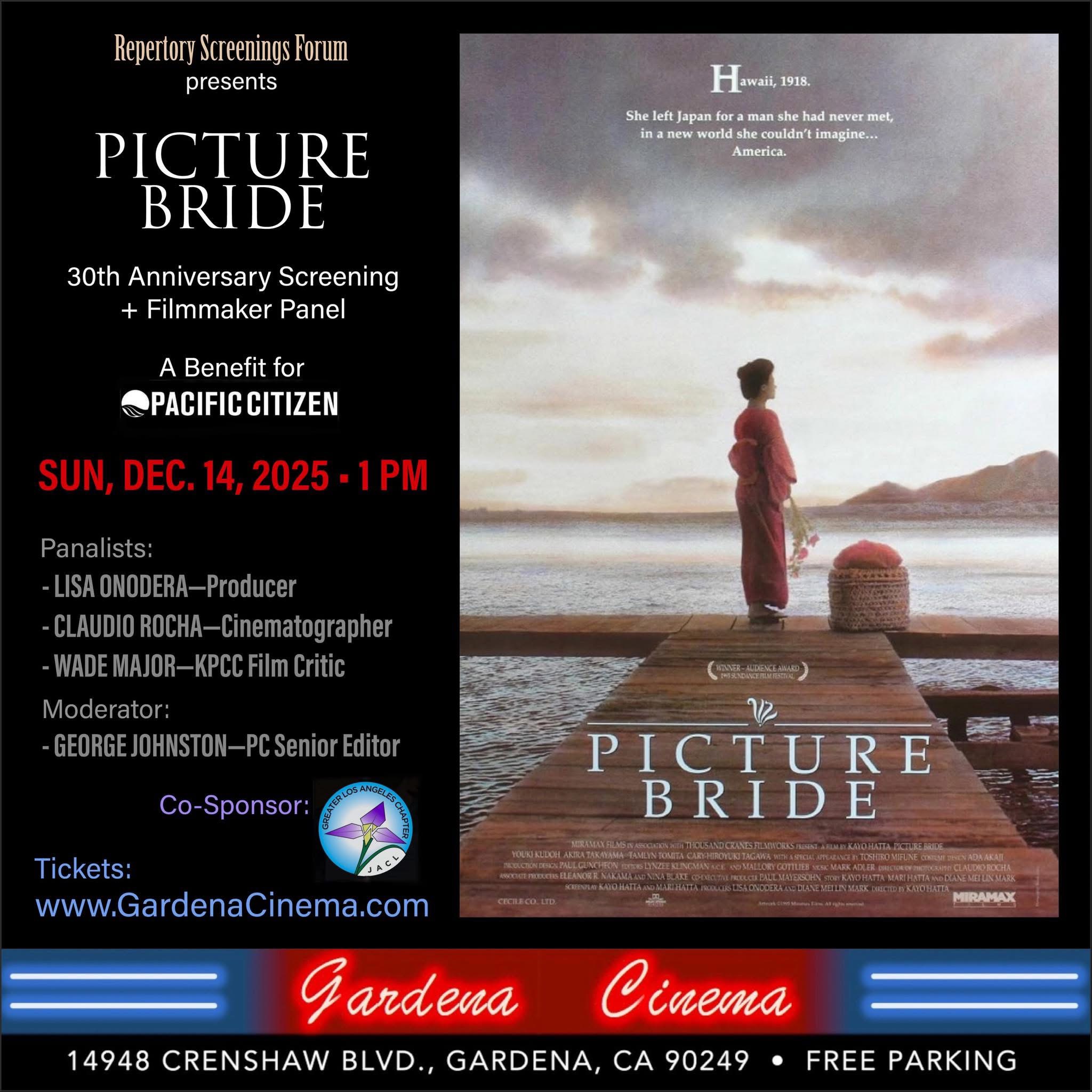 | 30th Anniversary Screening of "Picture Bride" hosted by The Repertory Screenings Forum and Greater Los Angeles JACL The Repertory Screenings Forum and Greater Los Angeles JACL are co-sponsoring a special one-time benefit screening of the award-winning 1995 movie “Picture Bride”. The screening will take place from 1-5 p.m. on Sunday, Dec. 14, at the 700-seat Gardena Cinema, located at 14948 Crenshaw Blvd. in Gardena, Calif. Built in 1946, the vintage Gardena Cinema is one of Los Angeles County’s last remaining independently owned, standalone movie houses. Tickets may be purchased online using the link below. A portion of the proceeds from the screening will benefit Pacific Citizen, the 96-year-old newspaper of the Japanese American Citizens League. |