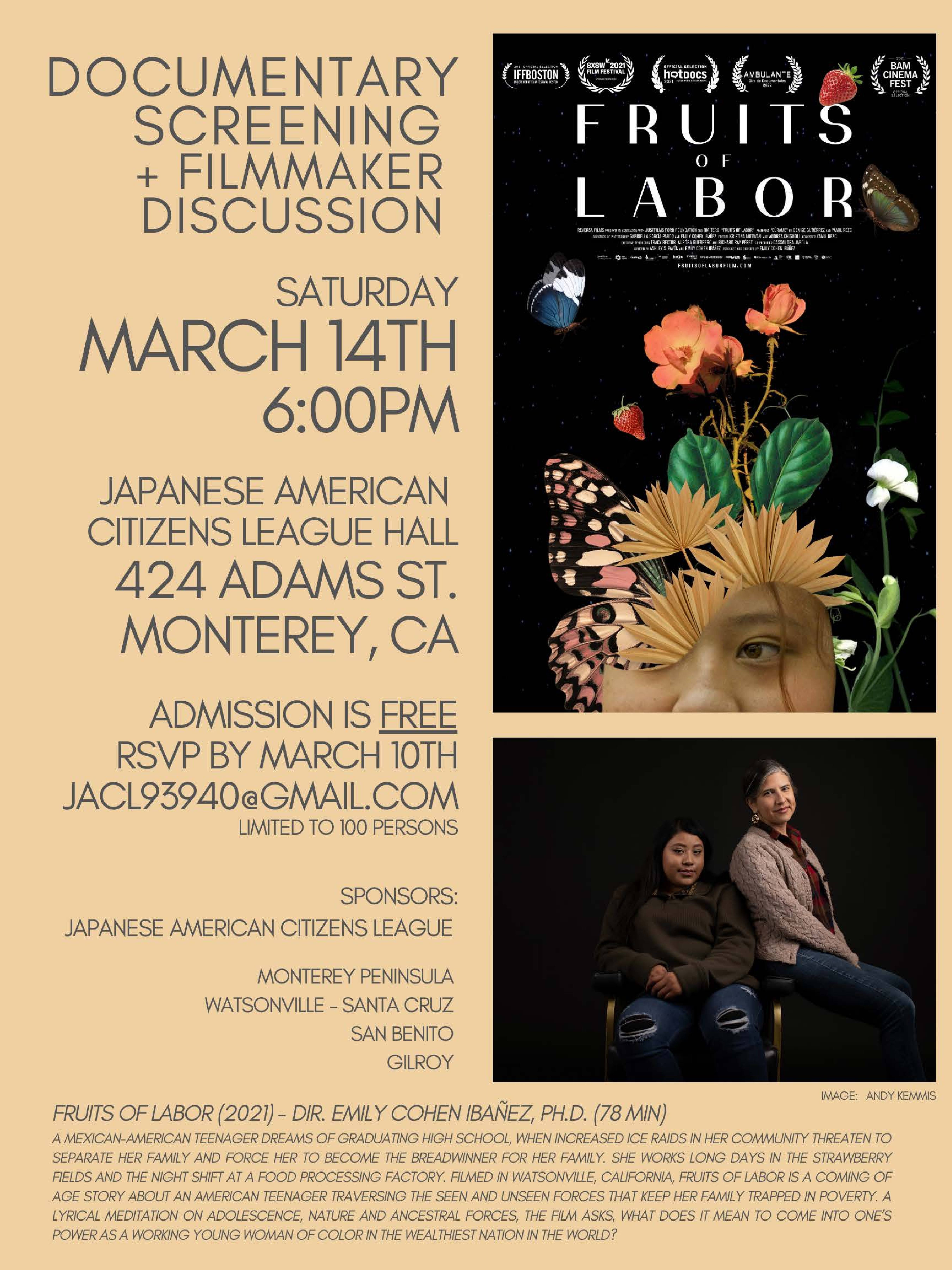 |  | | March 14: Monterey JACL Documentary Screening and Discussion - Fruits of Labor |