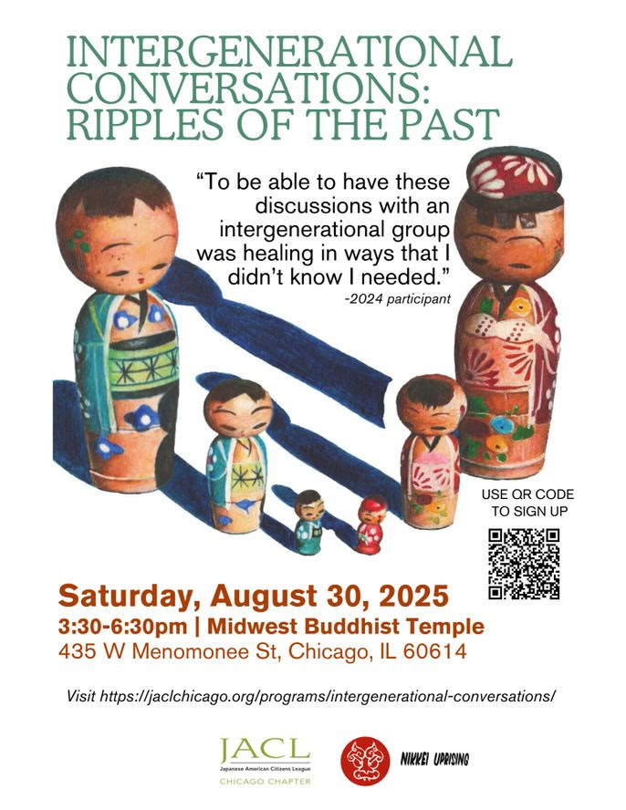|  | Saturday, August 30, 2025 | Midwest Buddhist Temple (435 W Menomonee St, Chicago IL 60614) Intergenerational Conversations: Ripples of the Past is a JACL Chicago and Nikkei Uprising program that brings Chicago-area Nikkei (people of Japanese ancestry) together to connect and process the trauma of WWII forced displacement and incarceration through personal story sharing. It was created to bridge the gap in programming for the community’s need for containers to reflect on and heal from the generational impact of incarceration. The goals for this program include: - expanding understanding and awareness of the impacts of the WWII displacement and incarceration,