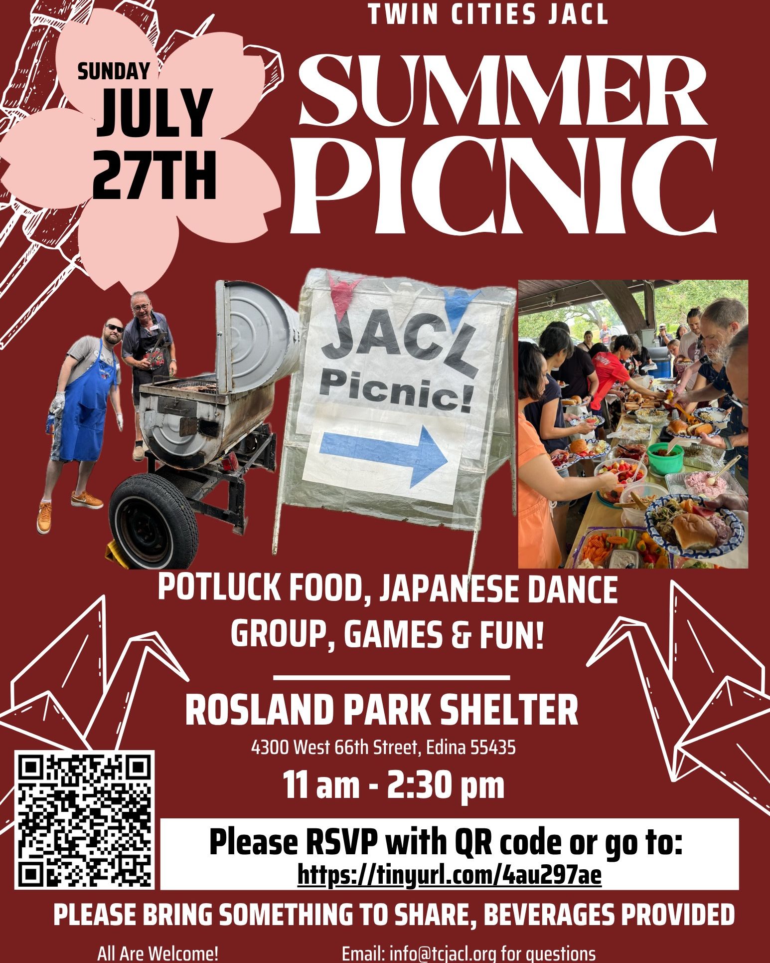 |  | Sunday, July 27th, 2025 11:00am - 2:30pm Rosland Park Shelter 4300 West 66th Street Edina, MN 55435 Join the Twin Cities JACL for our annual summer picnic, featuring great food, Japanese Dance, Games, and More! All are welcome! Bring your friends, family, and appetite. Please also bring something to share, and don't forget to RSVP! https://tinyurl.com/4au297ae |