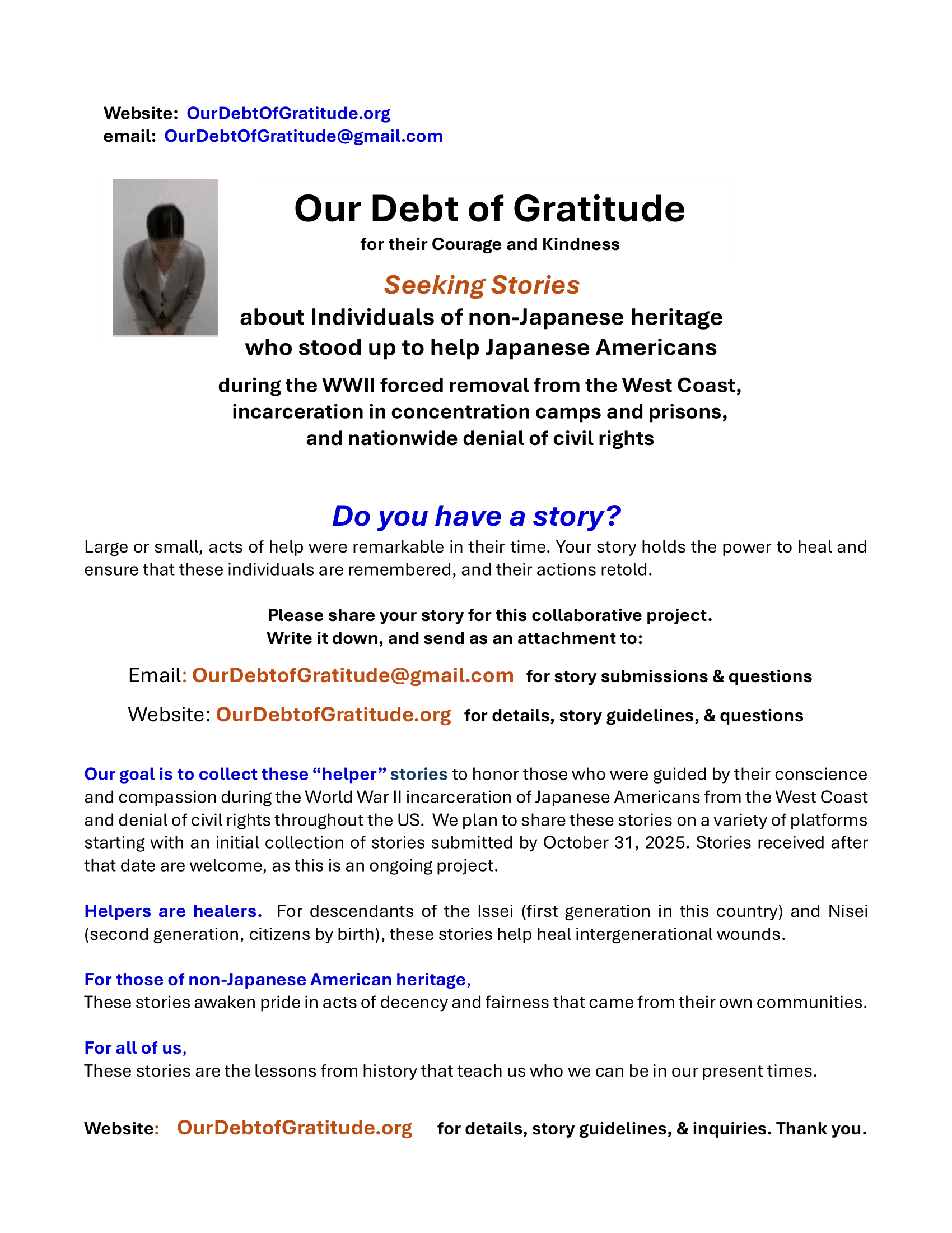 | | Our Debt of Gratitude - Seeking Stories of People Who Helped Japanese Americans During WWII |