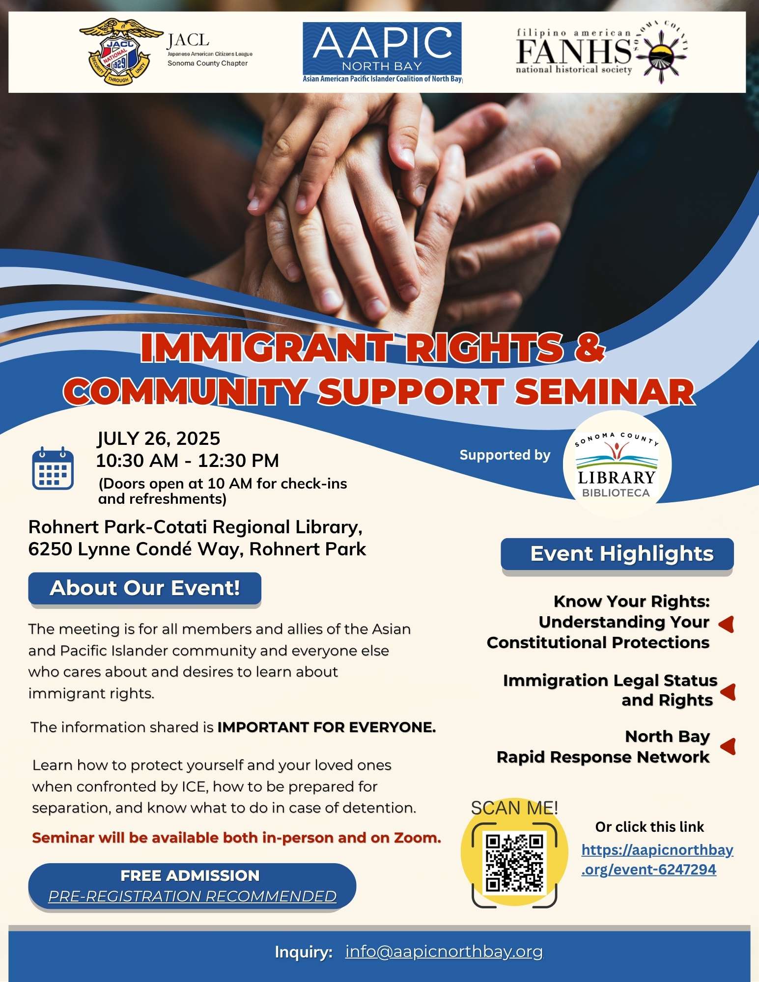 |  | Please join us for an important immigration rights seminar on Saturday, July 26. Doors open at 10:00 am for refreshments, and the program starts at 10:30 am (PDT). The seminar will be offered in person at the Rohnert Park-Cotati Regional Library, or you can attend on Zoom. You will hear from local activists and immigration rights attorneys. The information that will be shared is IMPORTANT FOR EVERYONE, not just those who are undocumented or know someone who is. Only when all of our community members are informed and know their rights can our at-risk community be protected. Pre-registration is recommended. For more information, see the attached flyer or click on this link: https://aapicnorthbay.org/event-6247294 Presented by Sonoma County Japanese American Citizens League (JACL), Filipino American National Historical Society (FANHS), and Asian American Pacific Islander Coalition of North Bay (AAPIC) |