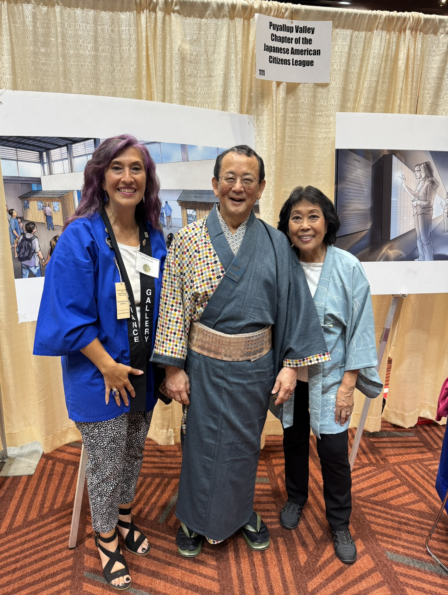 |  | Puyallup Valley Chapter was invited to this year's Japan Fair in Bellevue, WA. The purpose of this event is to celebrate Japanese art and culture. This is an endeavor of musicians, artisans, community organizations, and businesses from both Japan and the U.S. who come together to share their products, talents, and knowledge of Japan. Puyallup Valley shared the schedule for this year's Remembrance Gallery openings, plus the content of the Gallery. In addition, we presented a workshop about the legacy of the Issei as they traveled from Japan, the wartime incarceration, and rebuilding post-war. Using values of Yuuki, Shigata Ga Nai, Gaman, Gambatte, Kodomo No Tame Ni, and Okage Sama De, we connected the Issei to the current generations. Pictured are the table displays plus Sharon Sobie Seymour, Gallery manager; Allen Nakamoto, Japan Fair Chair; Eileen Yamada Lamphere, Puyallup Valley President. Puyallup Valley JACL was presented the Legacy Award for 2025. |