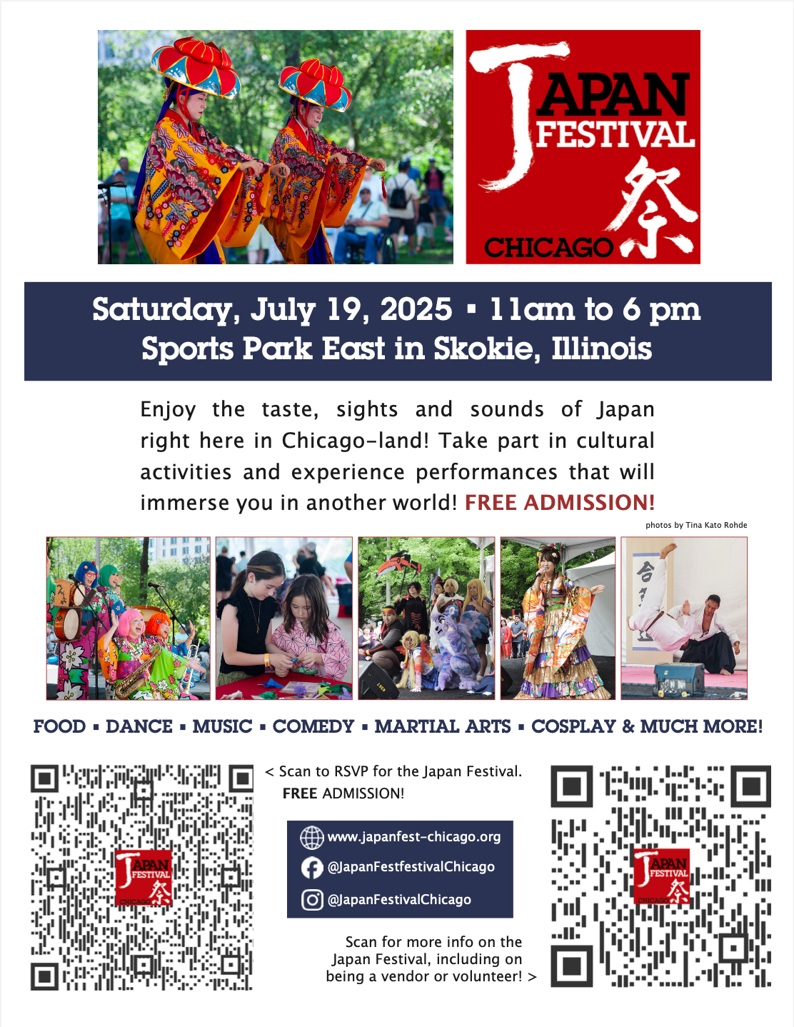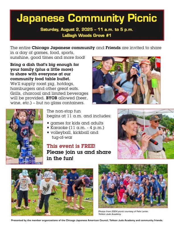 |  | | Saturday, August 2, 2025 | LaBagh Woods Grove #1 (Entrance at N Cicero Ave, north of W Foster Ave, Chicago, IL 60630) The entire Chicago Japanese community and Friends are invited to share in a day of games, food, sports, sunshine, good times and more food! Bring a dish that’s big enough for your family (plus a little more) to share with everyone at our community food table buffet. BYOB allowed (beer, wine, etc.) – but no glass containers. The non-stop fun begins at 11 a.m. and includes games for kids and adults, karaoke (until 4 p.m.), volleyball, kickball, and tug-of-war. This event is FREE! | | | |