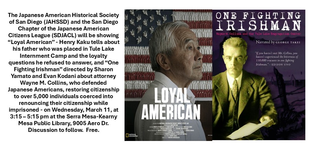 |  | | March 11: San Diego JACL screening of "Loyal American" and "One Fighting Irishman" |