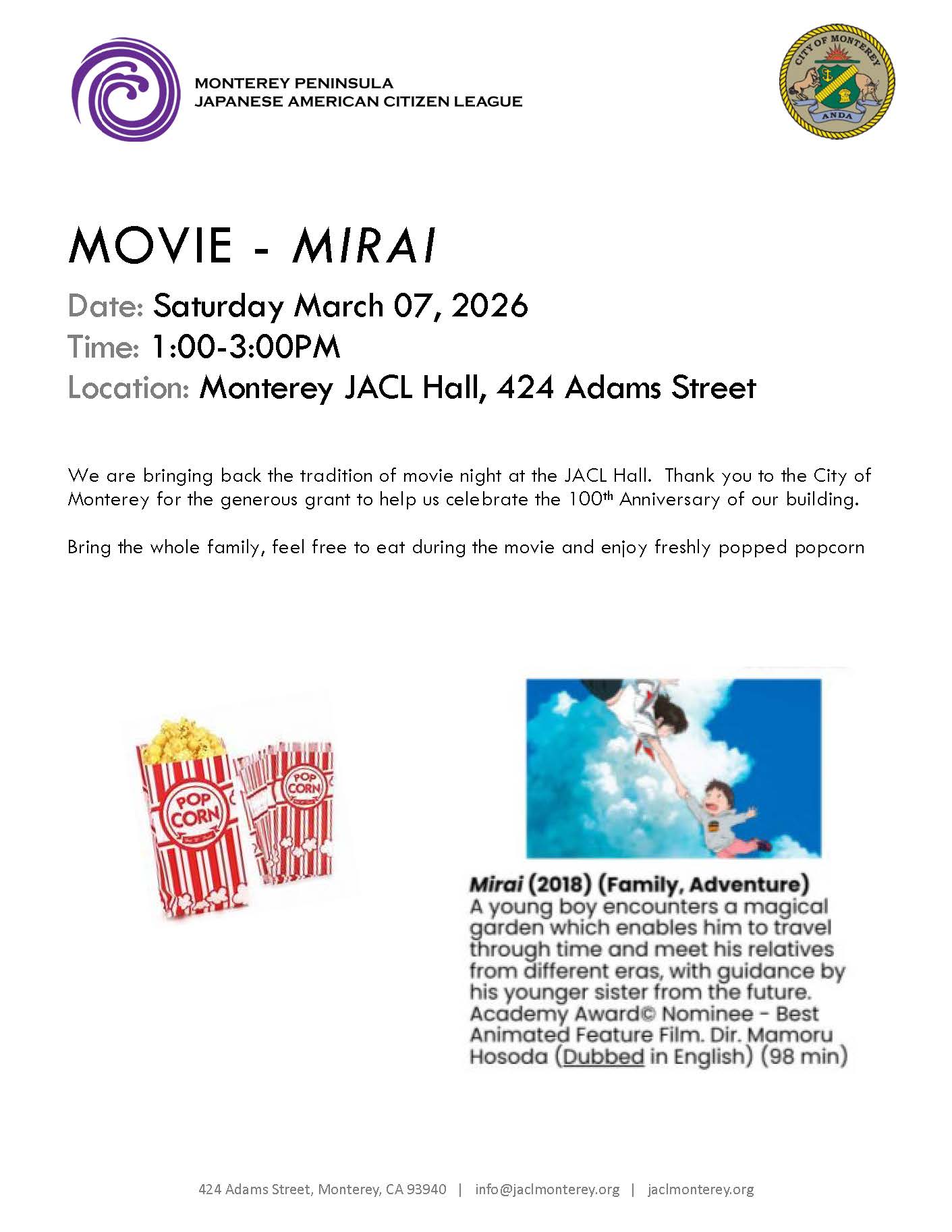 | | March 7: JACL Monterey Movie Night - Mirai |