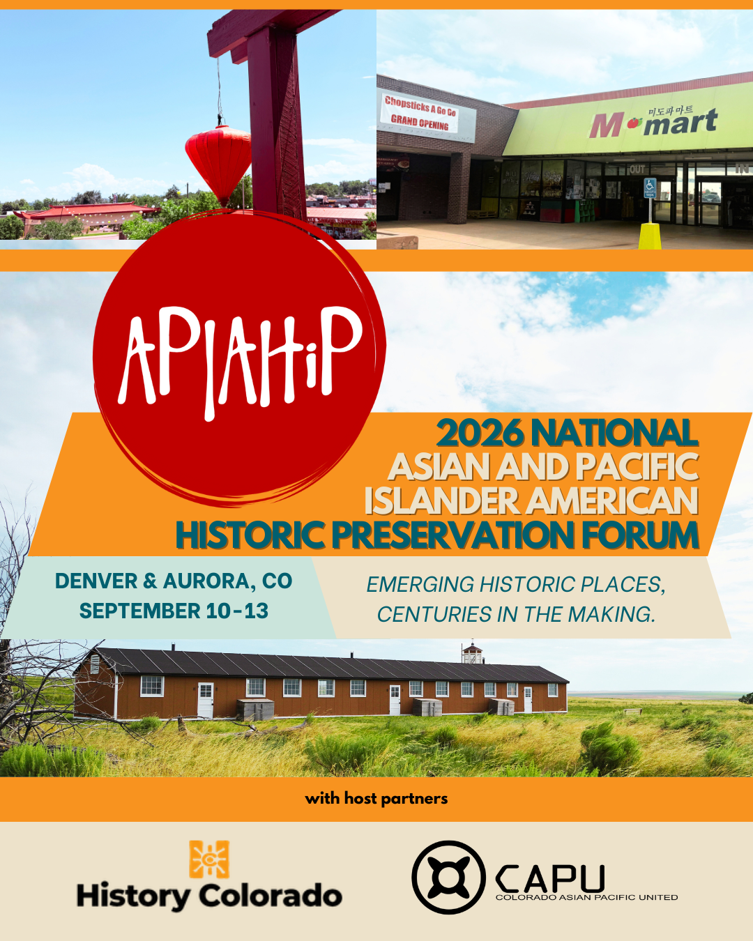 | | 2026 AAPIHiP Forum - Call for Proposals! FORUM is APIAHiP’s flagship gathering of enthusiasts and professionals dedicated to preserving historic places and cultural resources significant to Asian and Pacific Islander Americans. In 2026, we convene in the neighboring cities of Denver and Aurora, Colorado—communities where local and statewide efforts to Expand the Narrative are reshaping how APIA histories are understood, protected, and uplifted. Across the region, participants will explore stories and sites ranging from Denver’s lost Chinatown and the remaining block of Nihonmachi at Sakura Square, to Little Saigon’s Far East Center and Aurora’s Havana Street corridor with Koreatown roots, with opportunities to learn from places beyond the metro area such as Amache National Historic Landmark. Through sessions, workshops, and tours centered on collaboration, FORUM offers space to share strategies, build relationships, and strengthen a more inclusive preservation ethic. Join APIAHiP in Colorado as we honor the past, advance community-led stewardship, and affirm that our Emerging Historic Places are truly Centuries in the Making. |