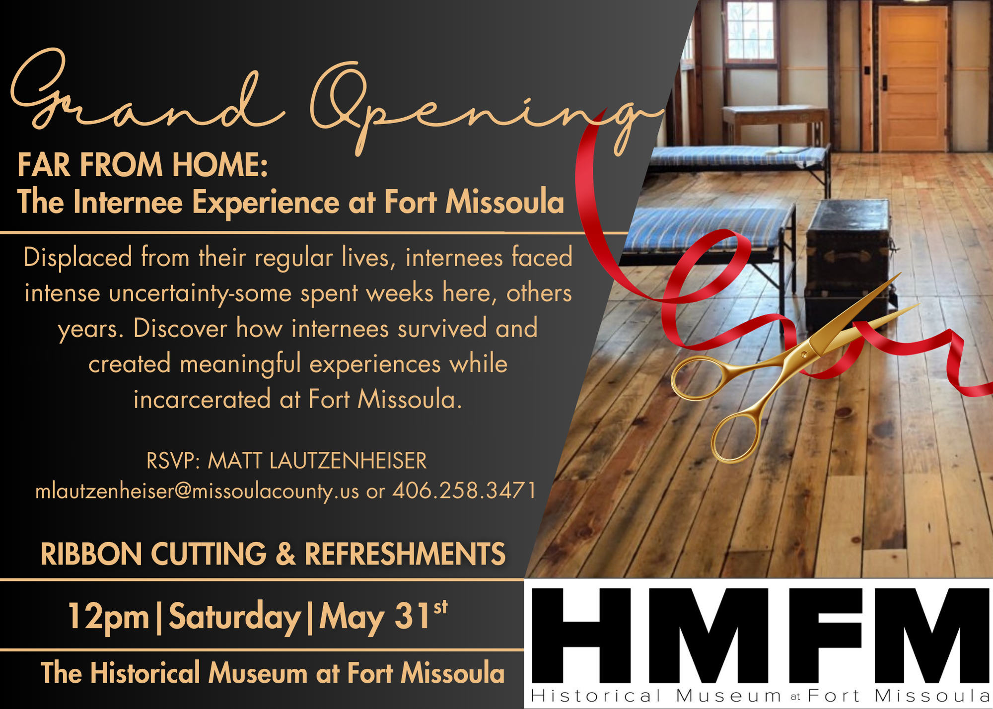 |  | Please join us as we share the newest exhibit and the next chapter in the internee story at the Historical Museum at Fort Missoula… GRAND OPENING: SATURDAY, MAY 31, 2025 AT 12PM FAR FROM HOME: AN INTERNEE EXPERIENCE AT FORT MISSOULA Displaced from their regular lives, internees faced intense uncertainty-some spent weeks here, others years. Discover how internees survived and created meaningful experiences while incarcerated at Fort Missoula. RIBBON CUTTING & REFRESHMENTS Please RSVP to Matt Lautzenheiser, mlautzenheiser@missoulacounty.us or 406.258.3471 *We appreciate your support and hope those unable to attend the event will contact the Museum for a guided tour at your convenience in the future. |