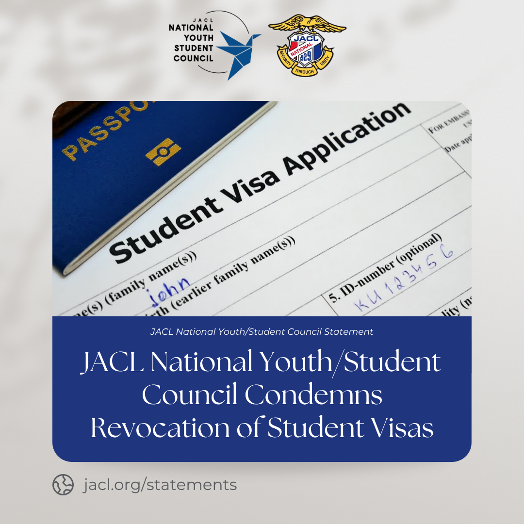 |  | May 14, 2025 The JACL National Youth/Student Council condemns the revocation of at least 1,487 visas from international students and recent graduates. This is a blatant attempt to intimidate university students and suppress political expression. The forced removal and incarceration of Japanese Americans during World War II, carried out without due process, stands as a stark reminder of what happens when fear and prejudice become the rule of law. As an organization rooted in civil rights and social justice, the JACL recognizes the dangerous parallels between past and present. Targeting individuals based on national origin or political expression undermines the fundamental principles of civil liberties. |