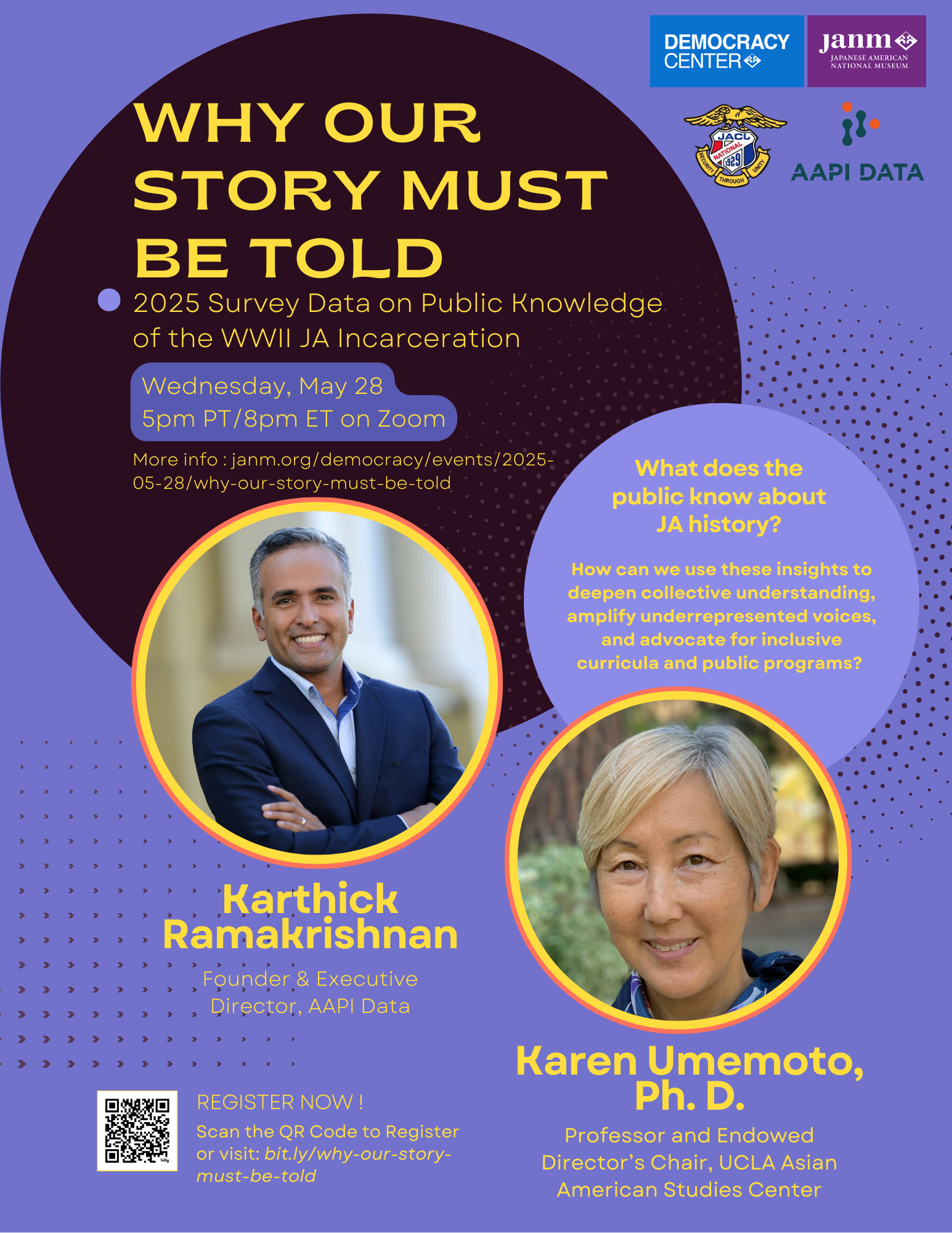 | | | Why Our Story Must Be Told: 2025 Survey Data on Public Knowledge of the WWII JA Incarceration with JANM and AAPI Data Tomorrow! |