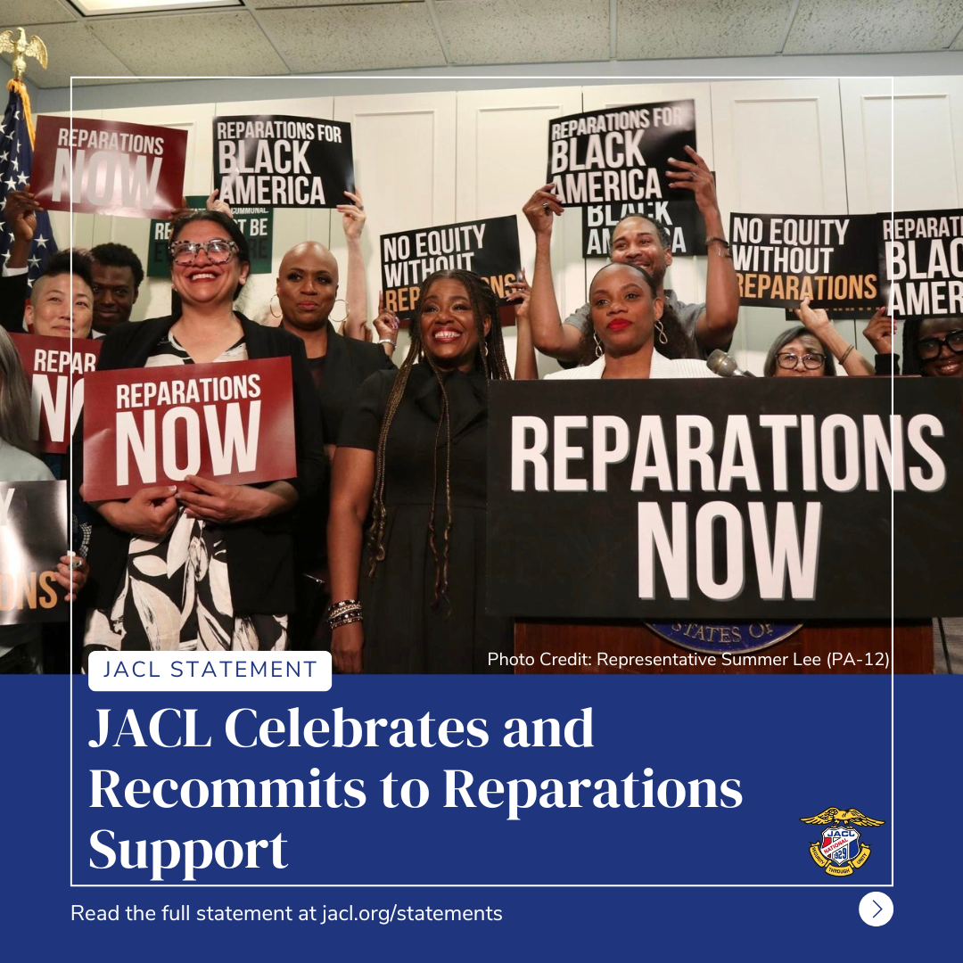 |  | May 21, 2025 JACL was honored to join two major reparations events this past week in Washington, D.C. On Thursday, May 15, Representative Summer L. Lee (PA-12) reintroduced the Reparations Now resolution, and on Saturday, JACL, in collaboration with the National Nikkei Reparations Coalition, participated in a National Reparations Rally in honor of Malcolm X’s 100th birthday. Introduced on May 15th, Congresswoman Lee’s Reparations Now resolution continues calling on Congress to take action in furthering reparations for descendants of slavery. The bill supports other similar bills like HR 40, in addition to finding ways to support local and state reparations work. JACL praises the work of Congresswoman Lee and her predecessor, Congresswoman Cori Bush, who have continually championed reparations through this bill and in other ways. In addition to JACL, the bill is supported by over 75 organizations. |