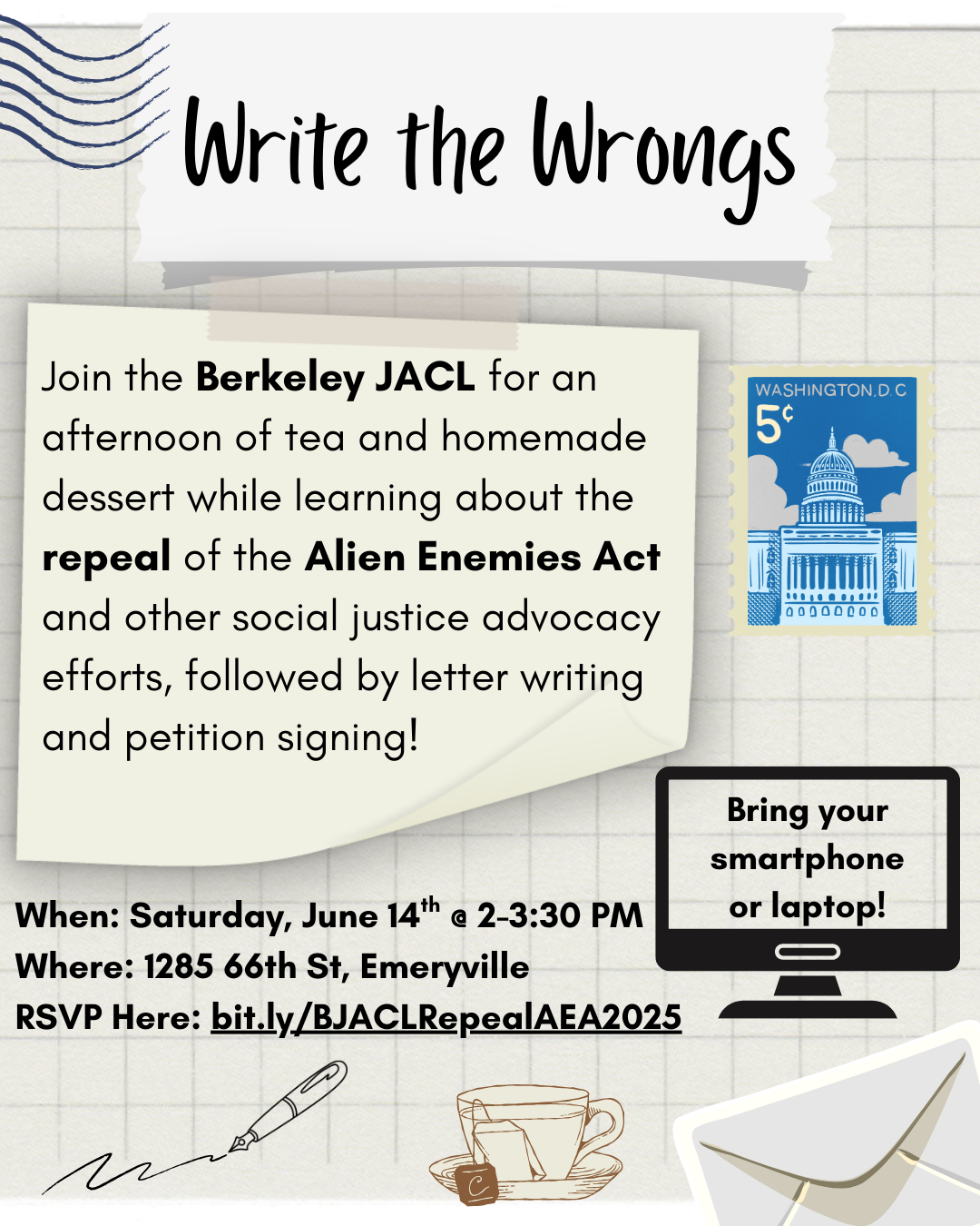 |  | Join Berkeley JACL for an afternoon of tea and homemade dessert while learning about the repeal of the Alien Enemies Act and other social justice advocacy efforts, followed by letter writing and petition signing! Bring your smart phone or laptop! |