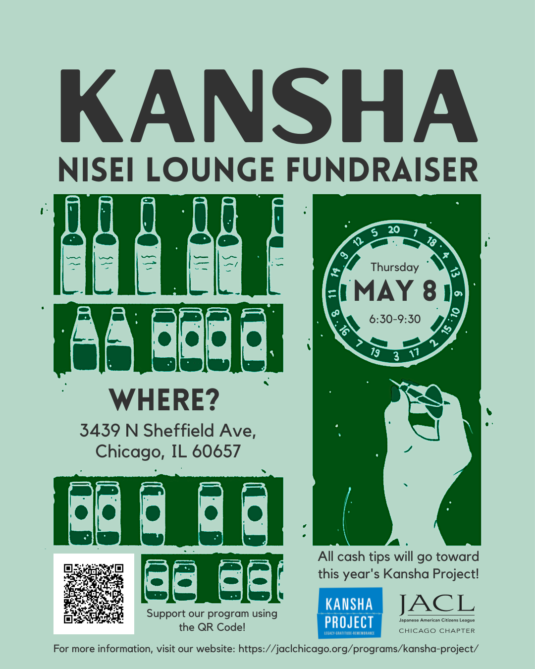 |  | Thursday, May 8, 2025 | 6:30-9:30PM Nisei Lounge | 3439 N Sheffield Ave, Chicago IL 60657 Join the Kansha Alumni Leadership Board (ALB) as we bring back our favorite community bartending fundraiser at the Nisei Lounge in Wrigleyville! Friends, family, and all community members are welcome! Kansha Project alumni will be guest bartending throughout the night. Come on by to get some drinks and socialize with Kansha folks and the community. All cash tips will go towards the Kansha Project program. The Kansha Project is a JACL Chicago program that connects self-identified Japanese Americans, ages 18-25, to the continuing legacy of the Japanese American community’s incarceration during World War II. The program centers around an educational trip to Los Angeles’ Little Tokyo neighborhood and Manzanar National Historic Site. This event is 21+. Please bring a valid form of ID. Can’t make the event? Donate to the Kansha Project at https://donorbox.org/2023-kansha-project |