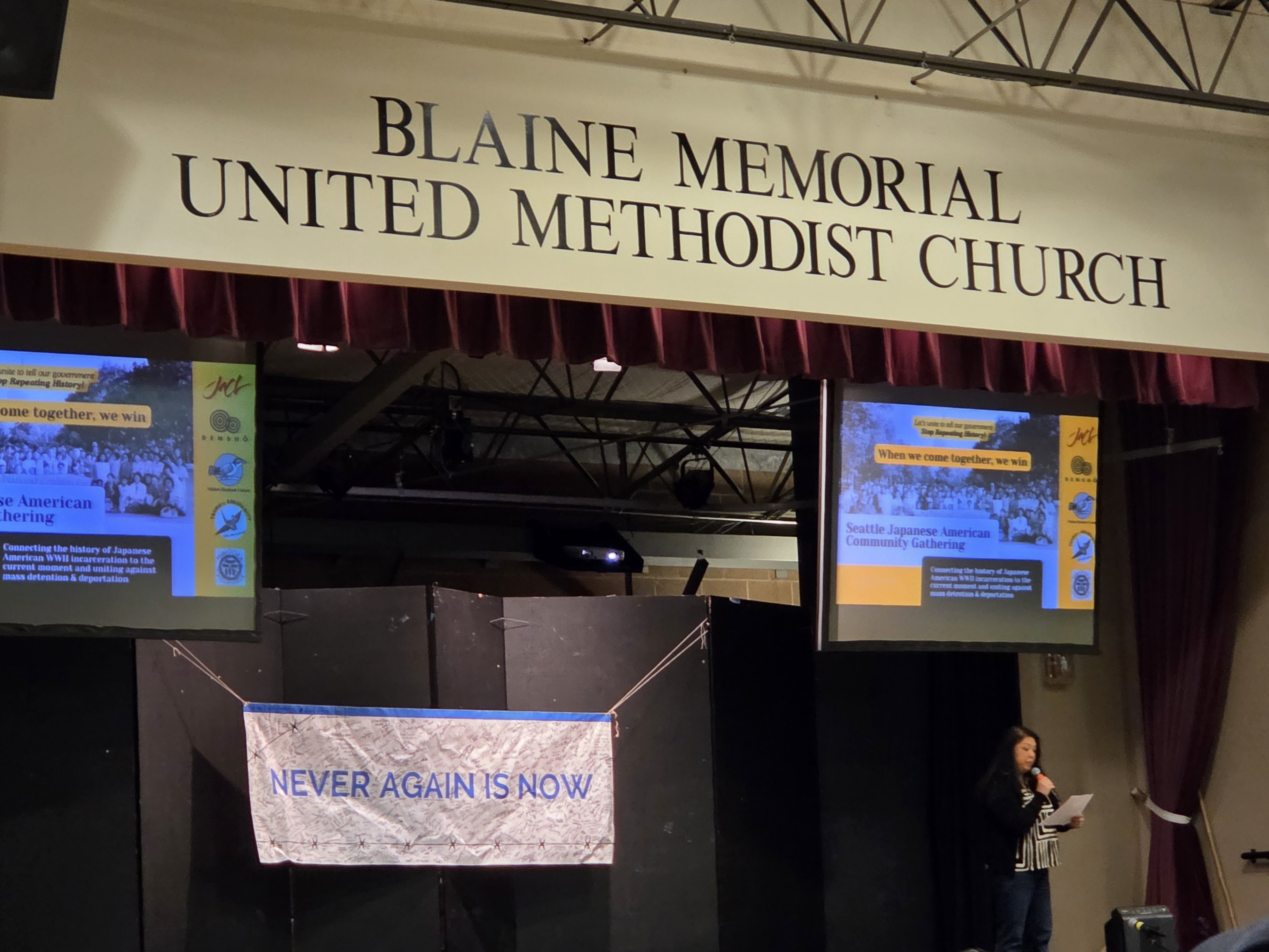 |  | Saturday, May 3rd, concerned members of the Seattle Japanese American Community gathered together at the Blaine Memorial United Methodist Church. The gathering was organized by Tsuru for Solidarity, Seattle JACL, Densho, UW Nikkei Student Union, and the Minidoka Pilgrimage. The purpose as stated by former Chapter President and Tsuru for Solidarity activist, Stan Shikuma: "Given the recent rash of actions by the Trump administration that echo many of the same injustices inflicted on the JA community in 1942, we feel it is imperative that the JA community stand up and speak out ASAP. Please come learn how our government is repeating history, share your views, make new friends, greet old friends, get involved, and help make our community's voice heard." The program included a focused review of history, past civil rights and Constitutional injustices, current challenges and outrages from the Administration, and defining three areas for JA community responses, i.e., mass detentions, deportations, and citizenship. The empowering portion of the afternoon was having the more than 150 attendees break into smaller groups where each individual shared who they were, their background, and why they came. After this sharing, each person gave their thoughts on what resistance meant to them and how they could best resist. It was a cathartic moment. There was power in realizing others felt the outrage that they felt, and each attendee was not alone in this outrage. Attendance (or "showing up") was resistance. Individuals pledged a variety of methods for future resistance, but there was consensus that "Never Again is Now" and the time for action is now." |