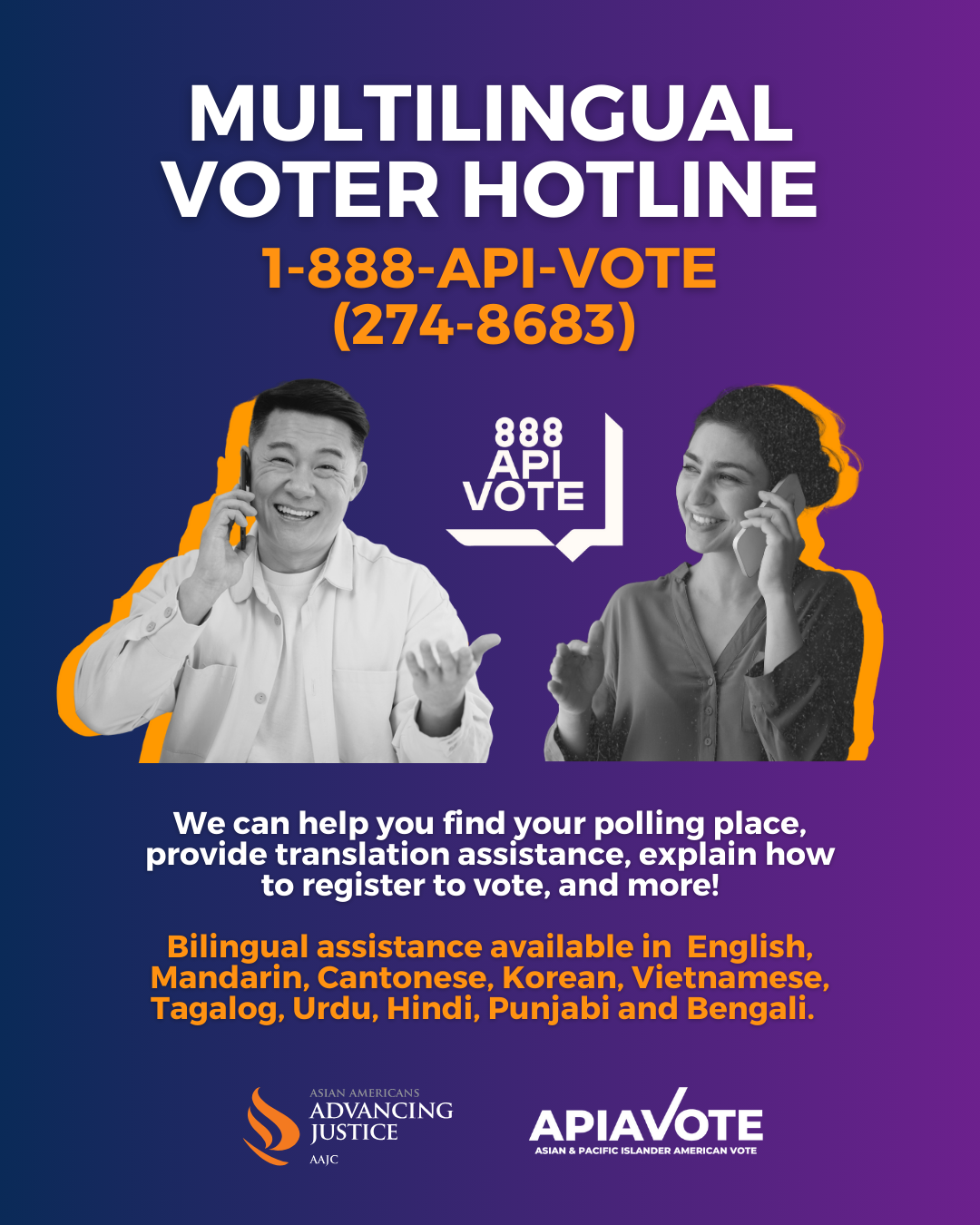 | | Election Day is Today! Have questions or need help voting this fall? Call APIAVote and Asian Americans Advancing Justice | AAJC’s Asian voter hotline at 1-888-API-VOTE (1-888-274-8683) for assistance! Bilingual support is available in: English, Mandarin (普通話), Cantonese (廣東話), Korean (한국어), Vietnamese (tiếng Việt), Tagalog, Urdu (اردو), Hindi (हिंदी), Bengali/Bangla (বাংলা), and Punjabi (ਪੰਜਾਬੀ). In the weeks leading up to Election Day, the hotline will operate through voicemail, and callers will receive a callback from the team. In the weeks leading up to the General Election, the hotline will be taking voicemails and providing callbacks. During Election Day, the hotline will be LIVE from 7am-11pm EST. Spread the word and support AAPIs exert their voting power this fall |
