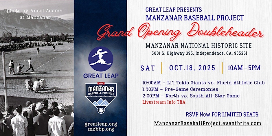 October 18: Manzanar Grand Opening Doubleheader hosted by Great Leap and Manzanar Baseball Project |