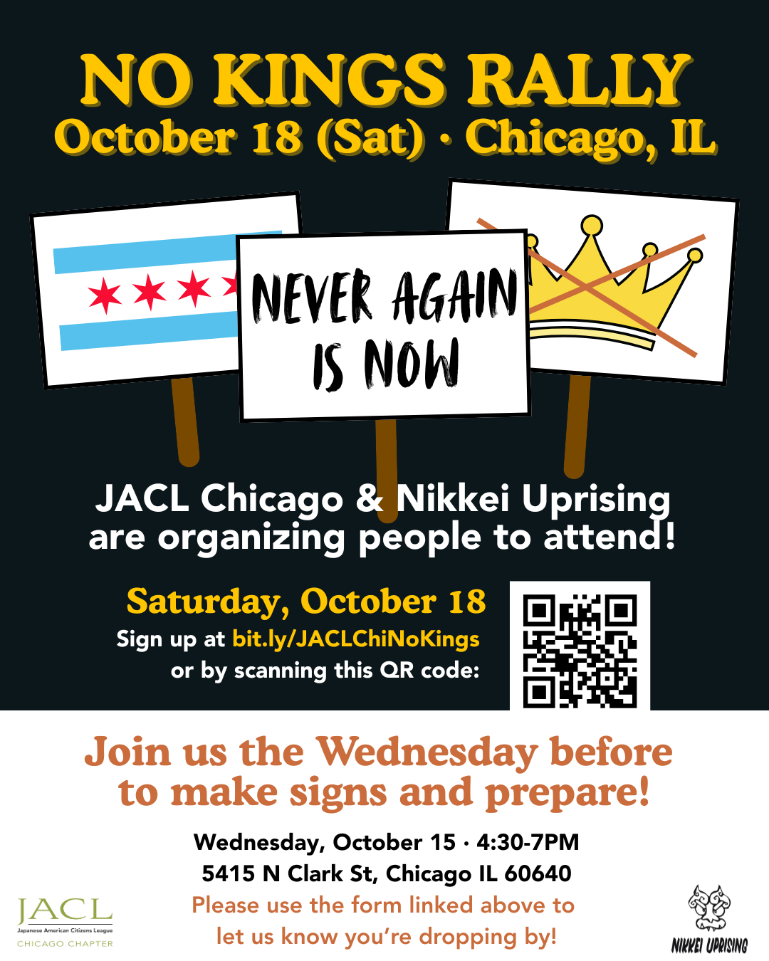 |  | Sign-Making Party: Wednesday, October 15, 4:30PM-7PM | 5415 N Clark St, Chicago IL 60640 Come join us at the JACL Chicago office on the Wednesday before the rally to make signs and prepare. Drop in anytime between 4:30PM and 7PM. Anyone is welcome, even if you can't make the rally! No Kings Day: Saturday, October 18, 11:30AM | Downtown Chicago, meeting location TBA JACL Chicago and Nikkei Uprising are organizing a contingency to attend the No Kings rally on Saturday, October 18, in downtown Chicago. If you are interested in joining our group, please sign up so we can send you meeting info! All are welcome to join (friends and family included). |