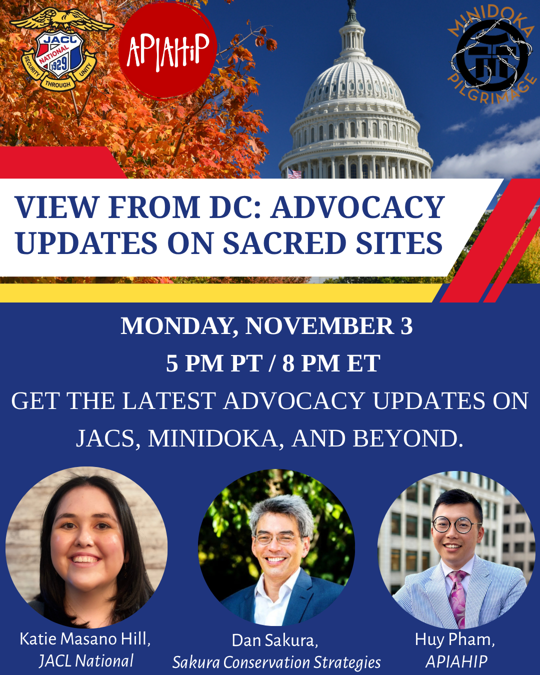| | Advocacy Updates on Sacred Sites: A View from DC We’re excited to share an upcoming webinar, “Advocacy Updates on Sacred Sites: A View from DC,” taking place on Monday, November 3rd at 5pm PT / 8pm ET. This conversation will feature Dan Sakura, conservation advocate; Katie Masano Hill from the Japanese American Citizens League (JACL); and Huy Pham from Asian and Pacific Islanders in Historic Preservation (APIAHiP). Together, they will discuss key federal updates and community advocacy efforts related to the preservation of Japanese American incarceration sites and other sacred places. Topics will include FY25 JACS grant funding, the FY26 appropriations process, the Lava Ridge–SWIP-N transmission line and its impact on Minidoka, ongoing preservation work by APIAHiP as we approach America 250, and updates on Japanese American Network bill implementation. |