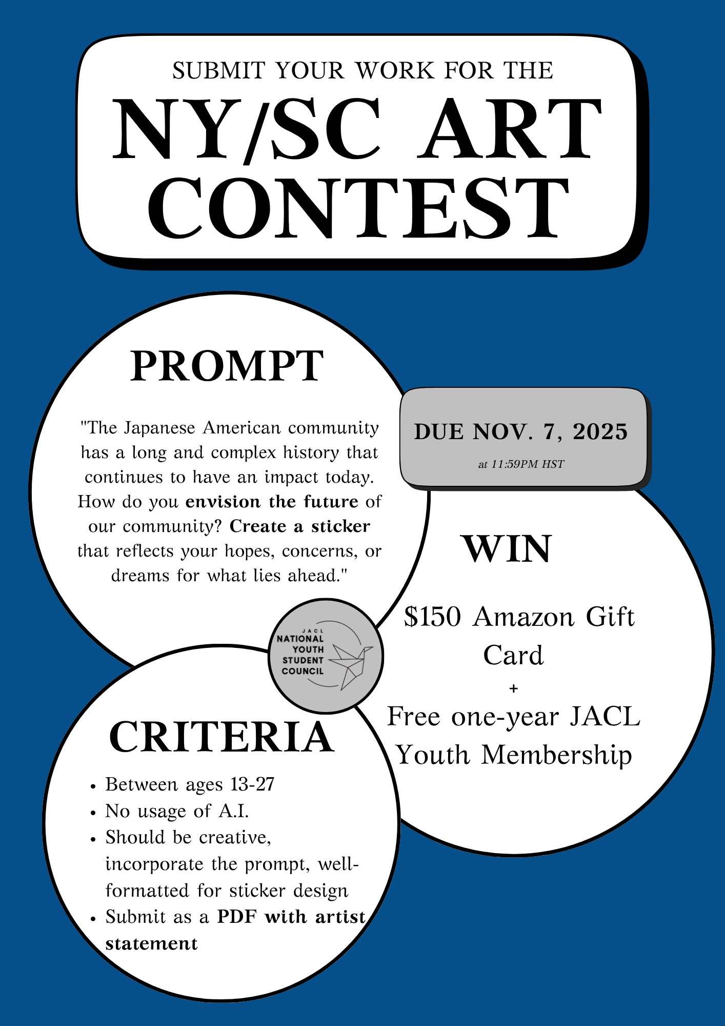 | JACL NY/SC Sticker Art Contest! The NY/SC is excited to announce a new art contest to design our next merch item — stickers! We want to create a platform and encourage the creativity of our community. Whether you are an avid artist or just enjoy a quick doodle every now and again, we encourage you to apply! Your design will be submitted via this google form, and your submission will be judged by current NY/SC members. Application will close November 7th at 11:59 PM HST |