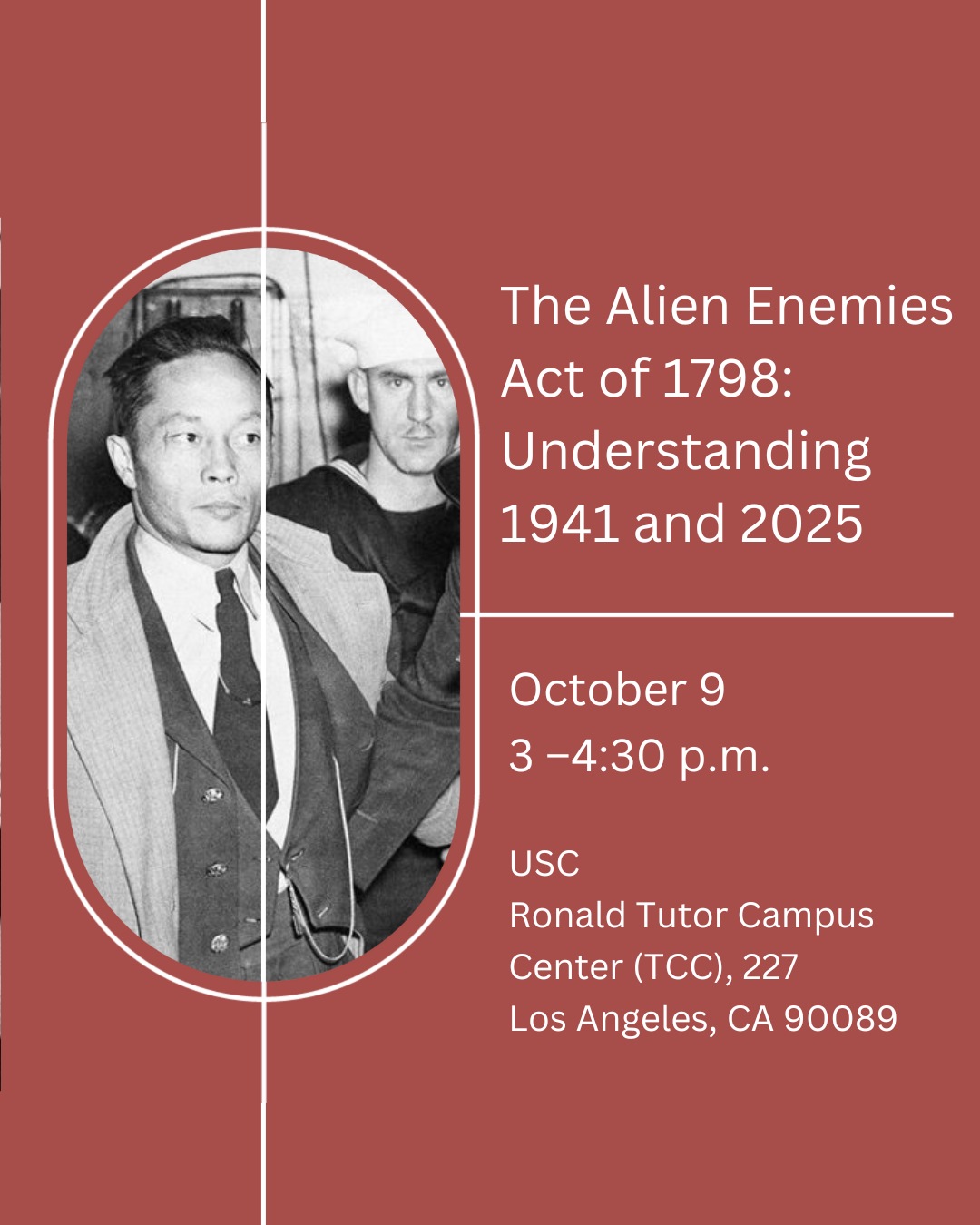 | USC Shinso Ito Center - The Alien Enemies Act of 1798: Understanding 1941 and 2025 - October 9, 2025 This panel will address how this act was applied to and impacted the Japanese American wartime community, ramifications of the current administration’s approaches, the status of the court cases challenging the administration’s use of AEA, and the amicus brief that was filed on behalf of descendants of Issei men who were imprisoned when the AEA was invoked in World War II. The speakers also will discuss how to accurately and effectively speak about the lessons from history when communities, especially those of color, live under the specter and reality of arrest, detention, and deportation. This is a hybrid event. Please click here to register for the Zoom link. Click here to RSVP for the in-person event. |