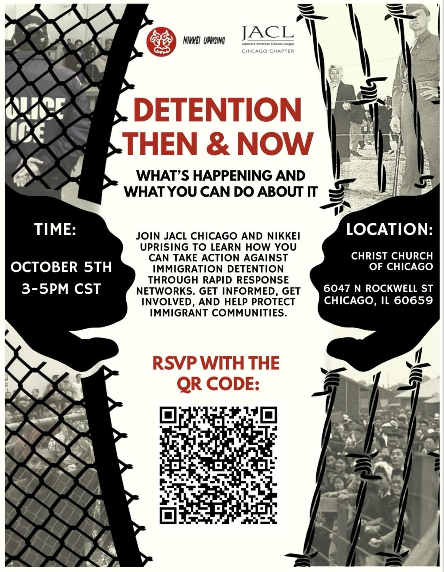 |  | Join JACL Chicago and Nikkei Uprising to learn how you can take action against immigration detention through Rapid Response Networks. Get informed, get involved, and help protect immigrant communities. All are invited to attend. While registration is strongly suggested, it is not required to participate in the event. Sunday, October 5th | 3-5PM CST Christ Church of Chicago - 6047 N Rockwell St, Chicago, IL 60659 |