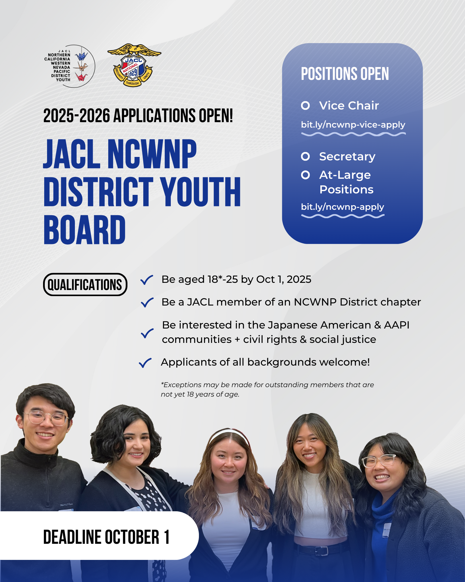 | JACL NCWNP District Youth Board Applications Open! The NCWNP District Youth Board is looking for dedicated young leaders to join our team! Whether you’re a seasoned activist or just starting your journey, this is your opportunity to step up and make a meaningful impact. Positions Available: Application Deadline: Wednesday, October 1st at 11:59pm PT Who’s Eligible? - JACL members in the NCWNP District