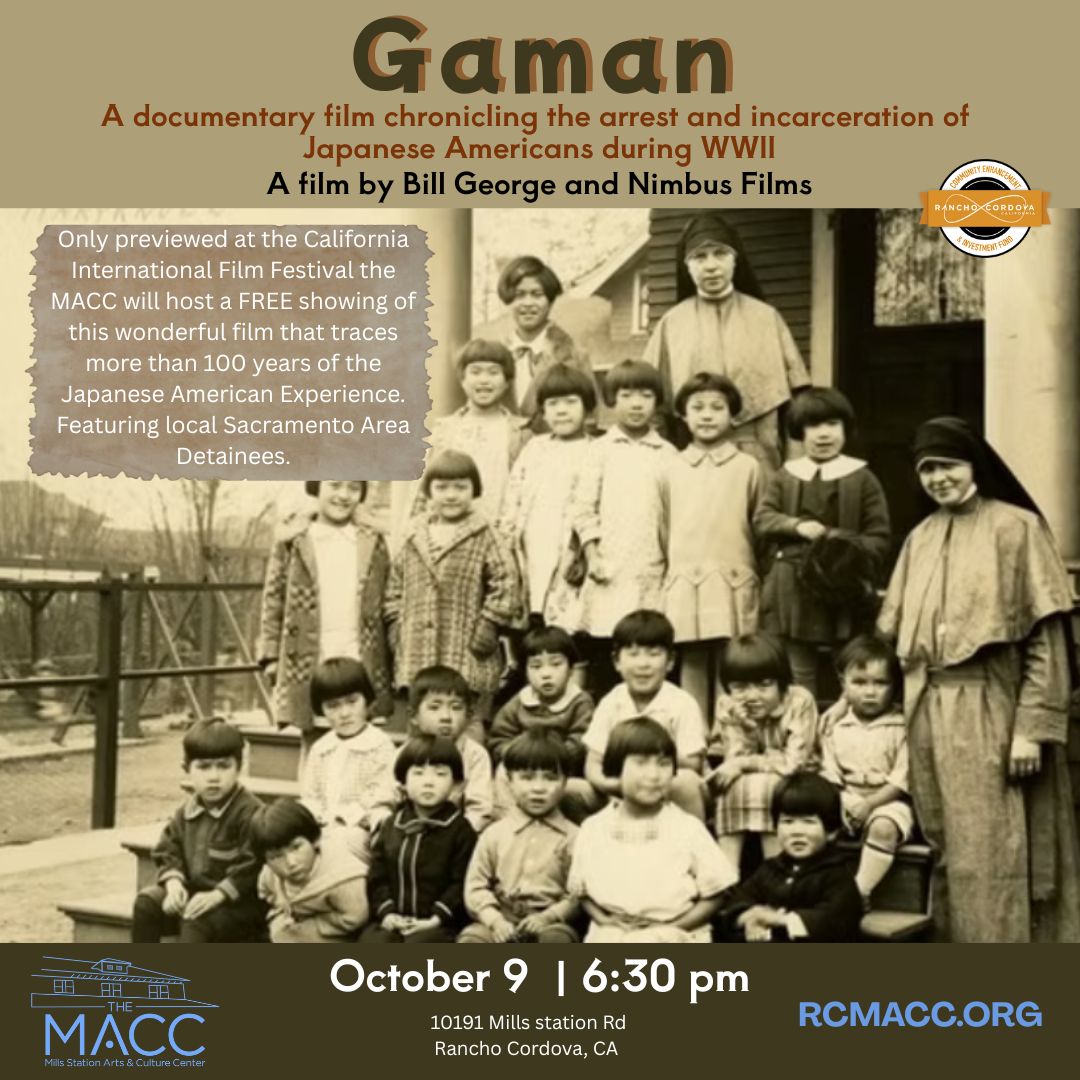 |  | Come out to RCMACC on October 9, 6:30 pm for the Sacramento screening of "Gaman," a documentary by local historian and videographer, Bill George. Local, Kiyo Sato, is in the documentary along with other Nisei. First-come first-serve! |
